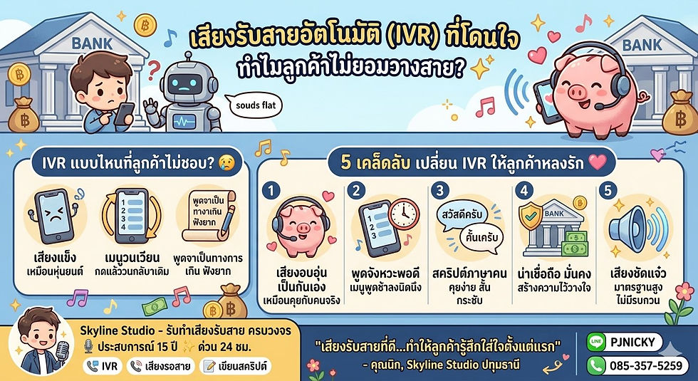 "เสียง IVR ที่ดีไม่ได้แค่บอกให้กดหมายเลข — มันทำให้ลูกค้ารู้สึกว่าธุรกิจของคุณใส่ใจพวกเขาตั้งแต่วินาทีแรก" | คุณนิก, Skyline Studio ปทุมธานี